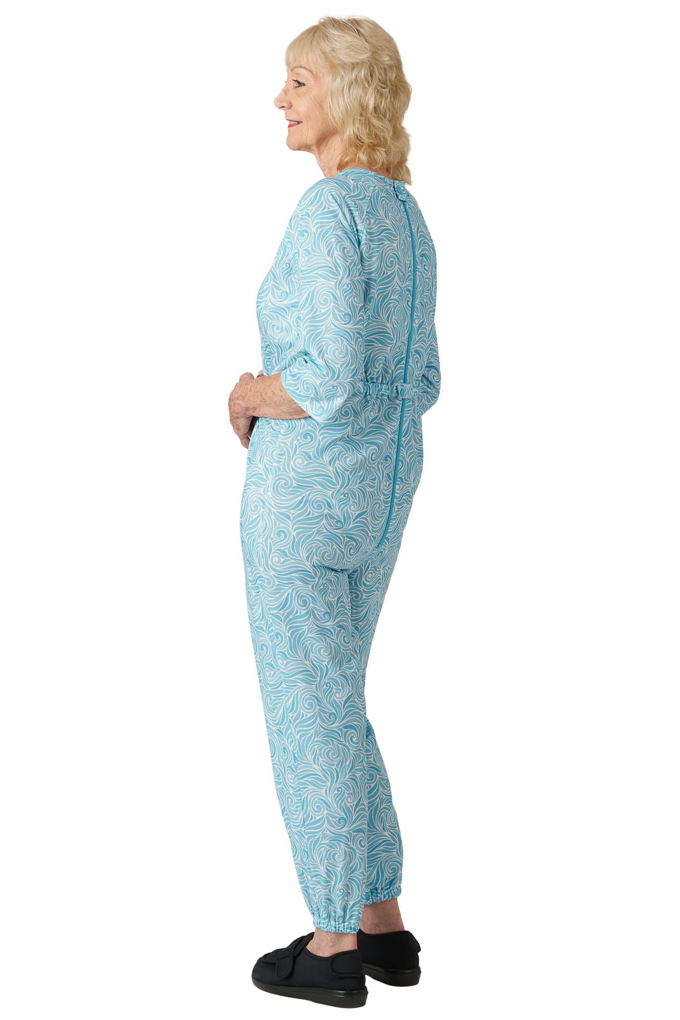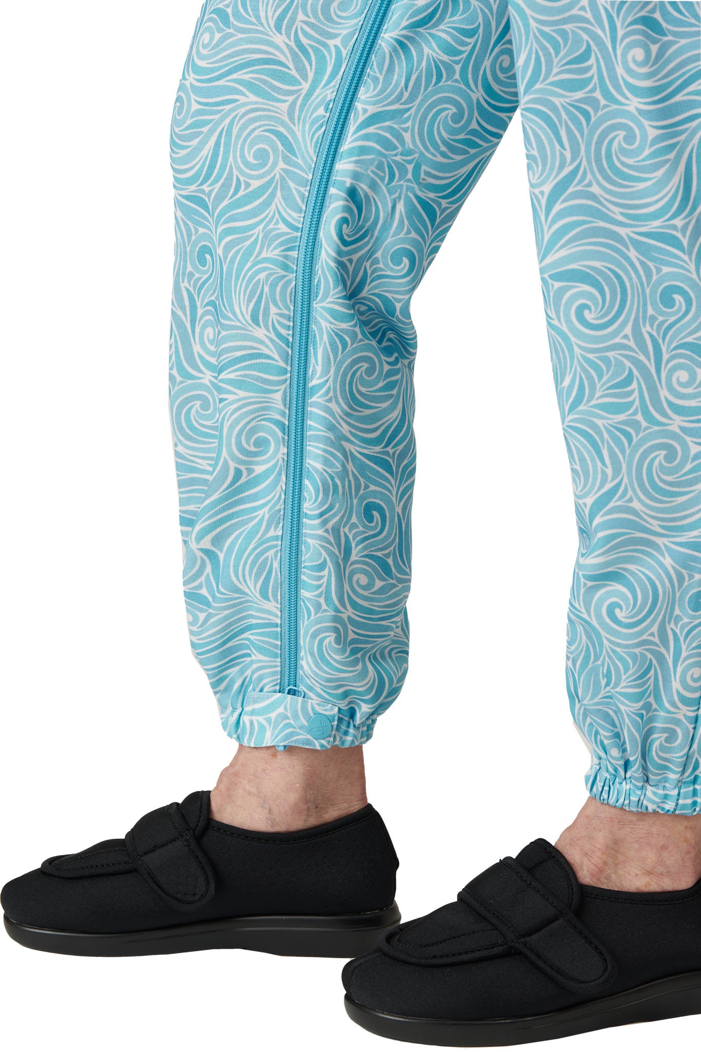 - Les longues fermetures éclairs au dos et à l’entrejambe facilitent le changement des sous-vêtements d’incontinence et permettent un habillage sans douleur.