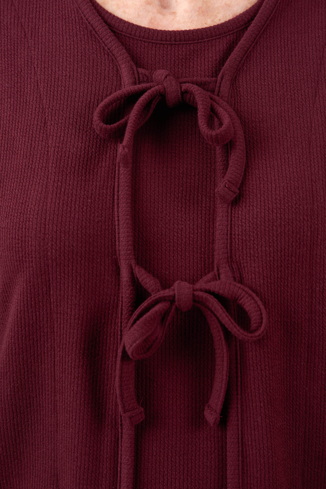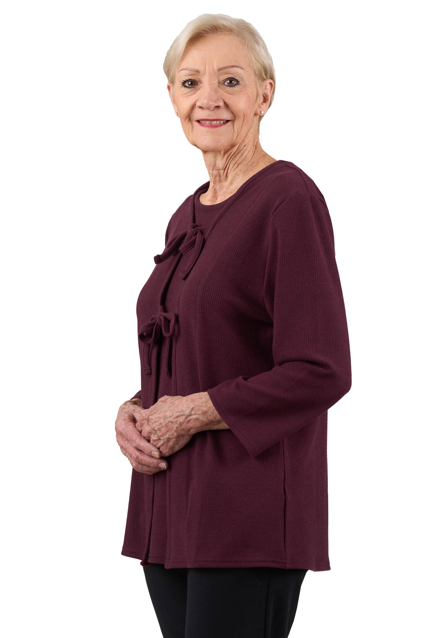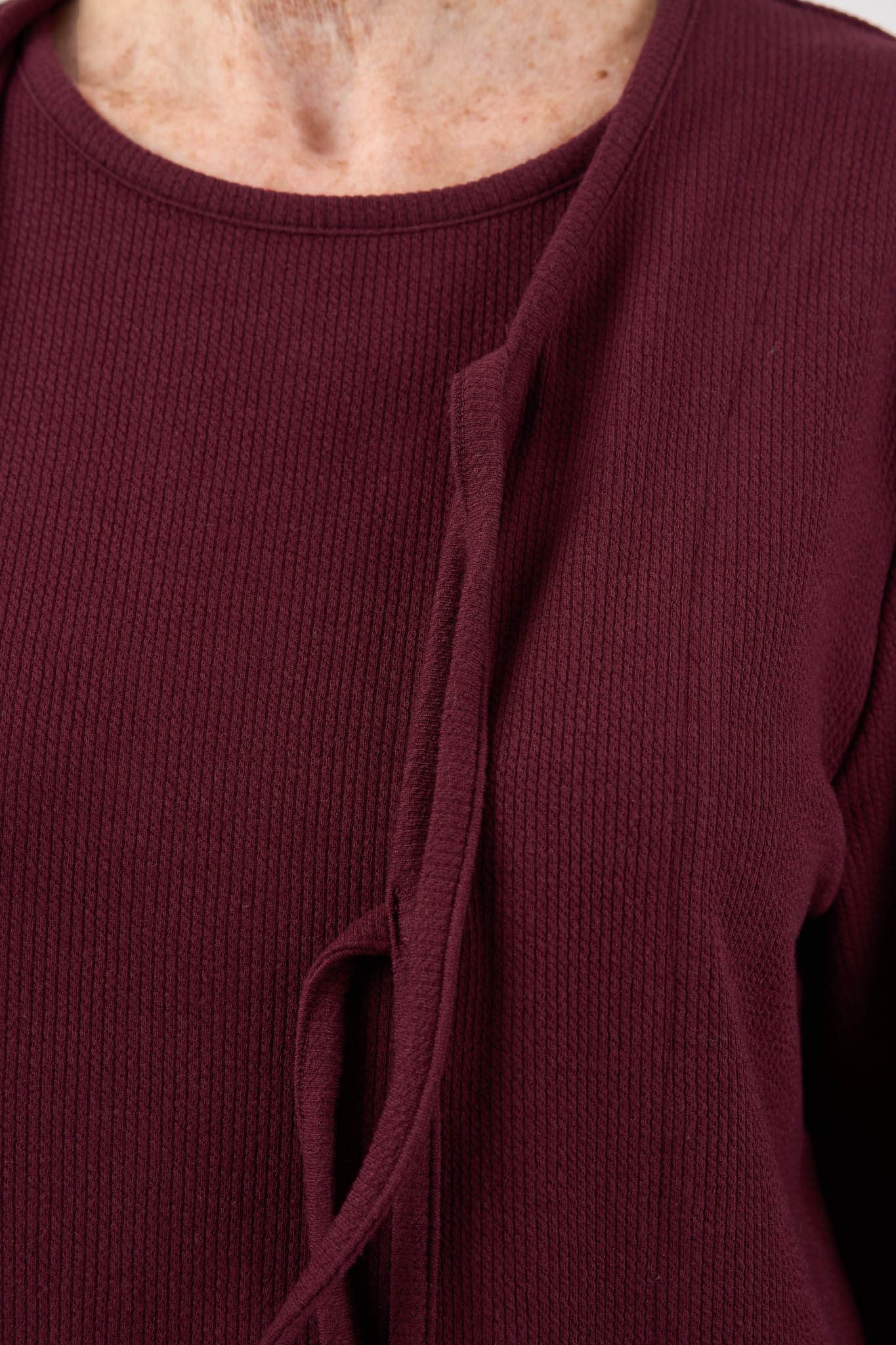 Tricot uni, texture mini cable, faux ensemble double avec cordon, manches 3/4. Large ouverture arrière avec attaches à bouttons-pression.