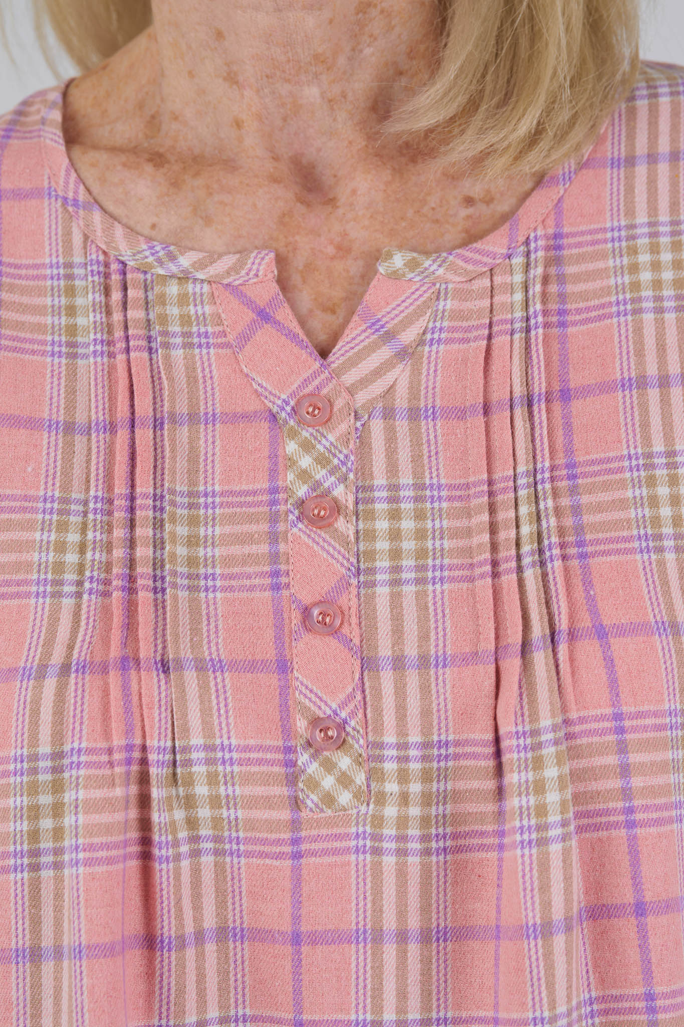 Le confort à son meilleur pour être porté de jour comme de nuit! Flannelle tissé à carreaux avec une encolure ronde, des manches 3/4 et un détail de pli à l'avant. La robe de nuit Elsa est conçue pour éviter de se peloter pendant la nuit, ce qui signifie une bonne nuit de sommeil. Dos ouvert avec fermeture à boutons-pression pour un habillage facile.