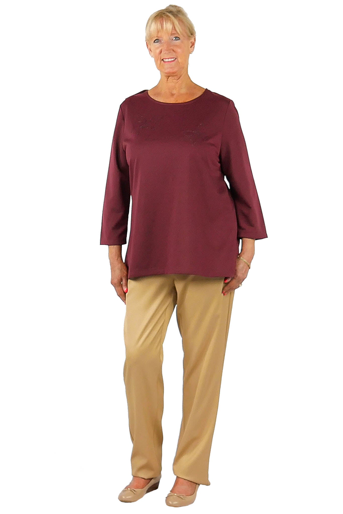 - Les papillons appliqués à l’avant de ce haut bourgogne lui donnent ce petit extra qui en fait le match parfait pour la plupart de vos bas. Tissu soyeux et coupe décontractée pour plus de confort et aisance dans vos mouvements.