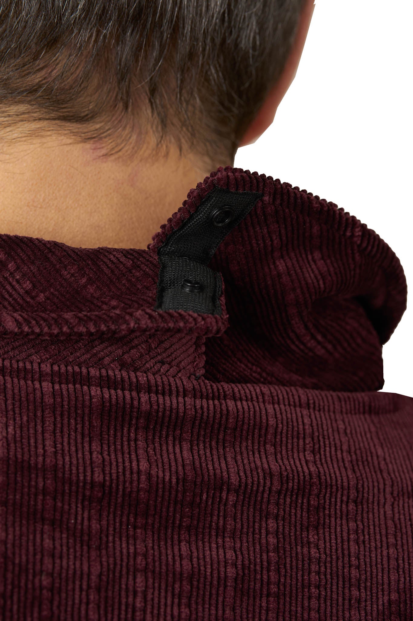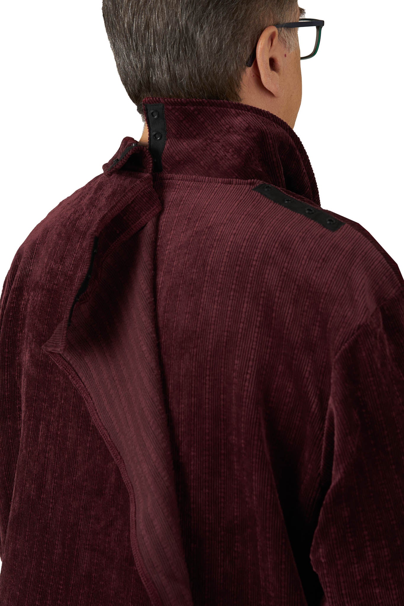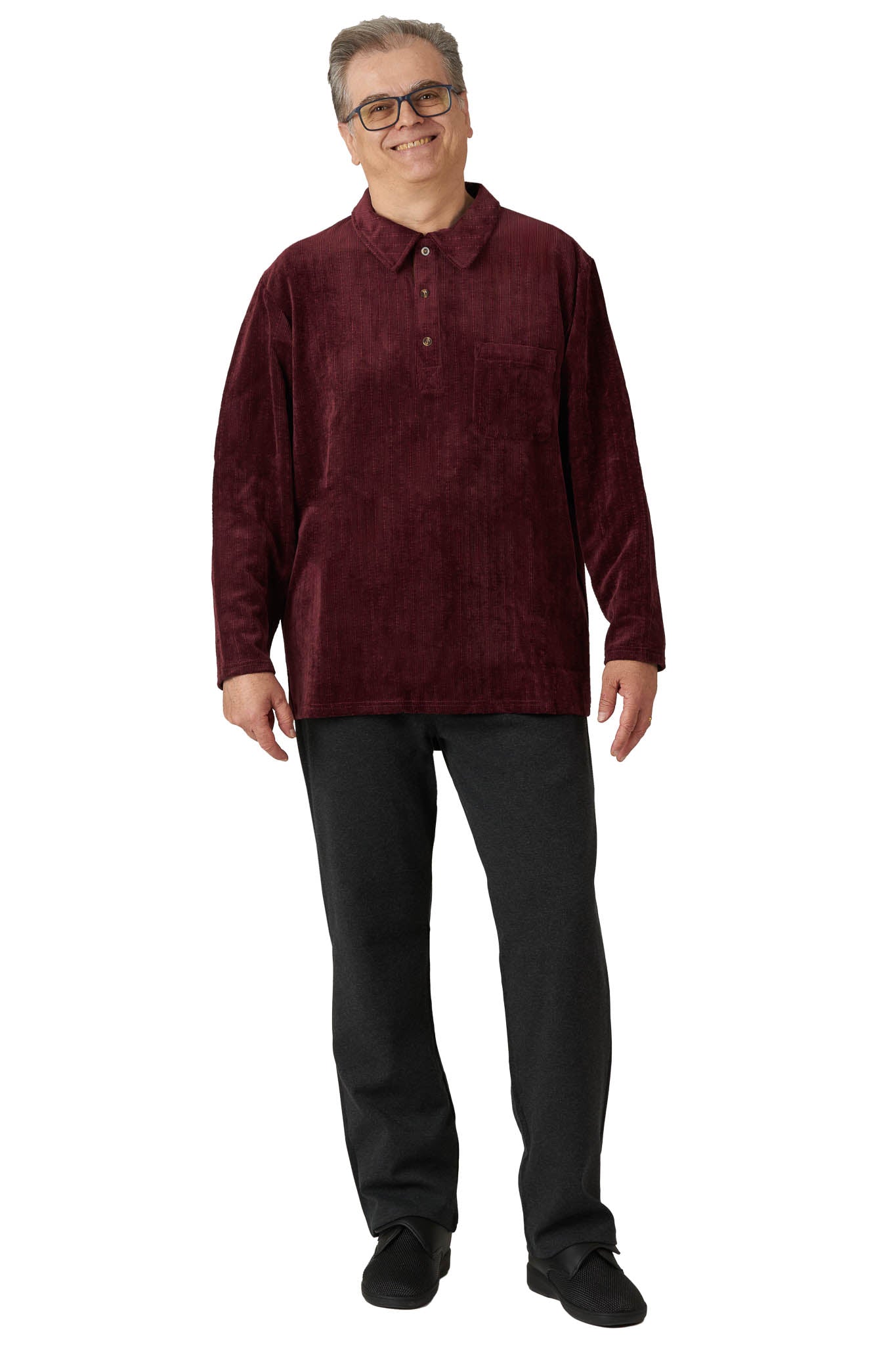 Col polo à manches longues en tricot de velour côtelé avec simili suède sur la patte intérieur avant. Ouverture complète au dos avec fermeture à bouton-pression! Idéal pour l'habillage assisté par un soignant ou un proche aidant.