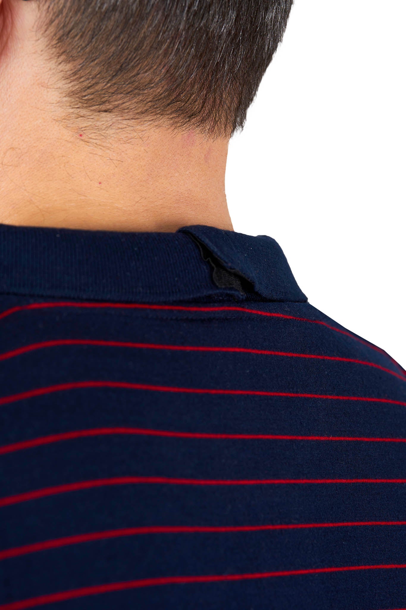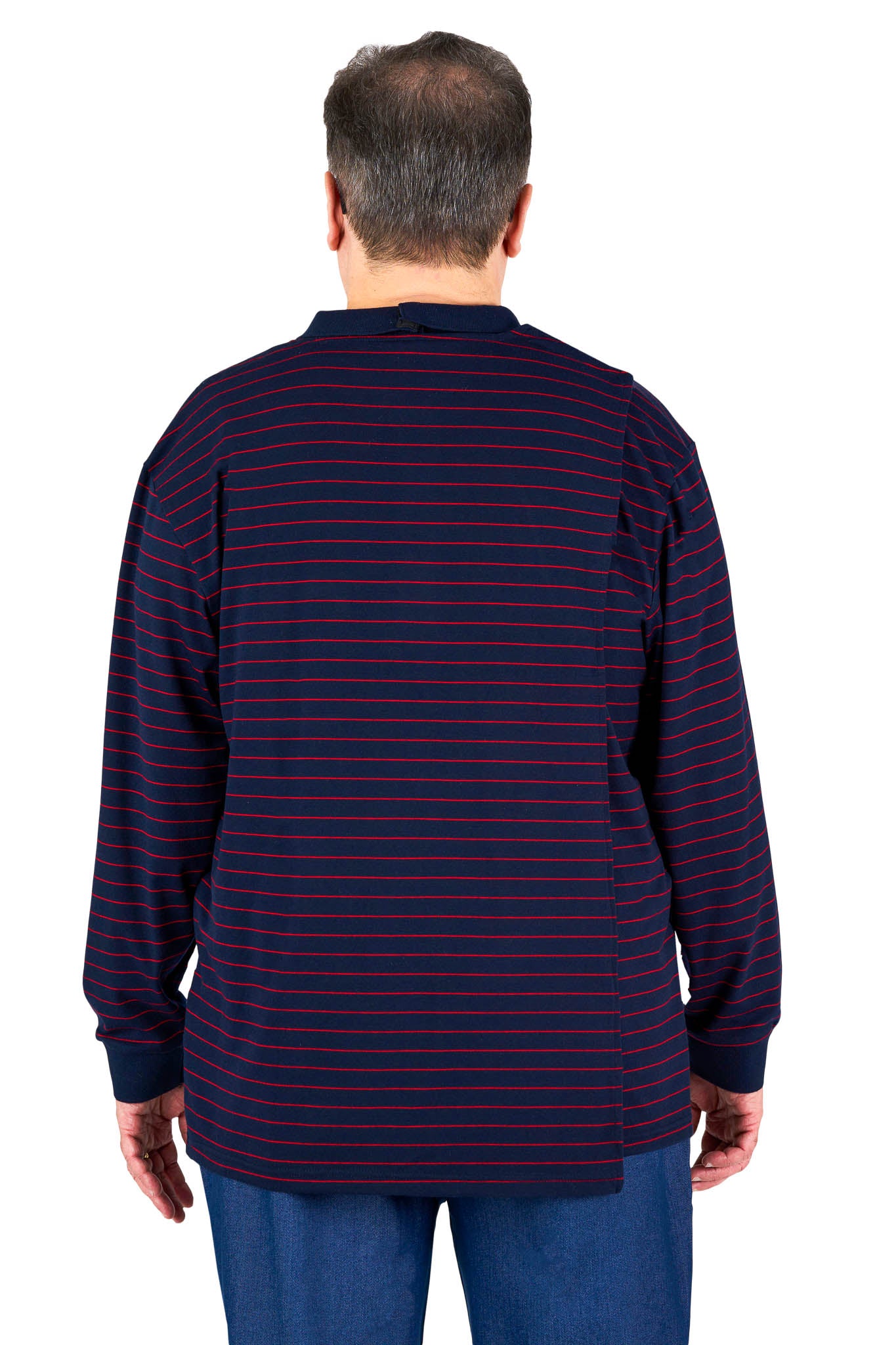 Chandail polo à manches longues avec rayure rouge et col contrastant marine qui passe pour votre chandail polo habituel, ne serait-ce de l’ouverture complète au dos avec fermeture à bouton-pression! Détails de poches à l’avant. Idéal pour les hommes à mobilité réduite ou en perte d’autonomie.
