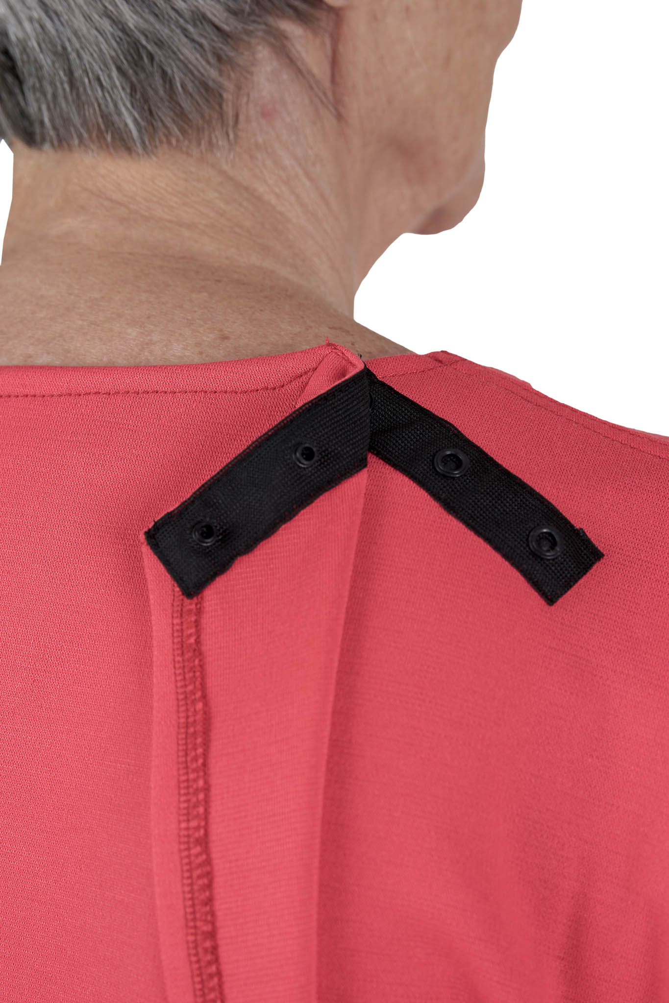 - It's full back opening and conveniently placed snap buttons on each shoulder makes it perfect for caregiver assisted dressing.