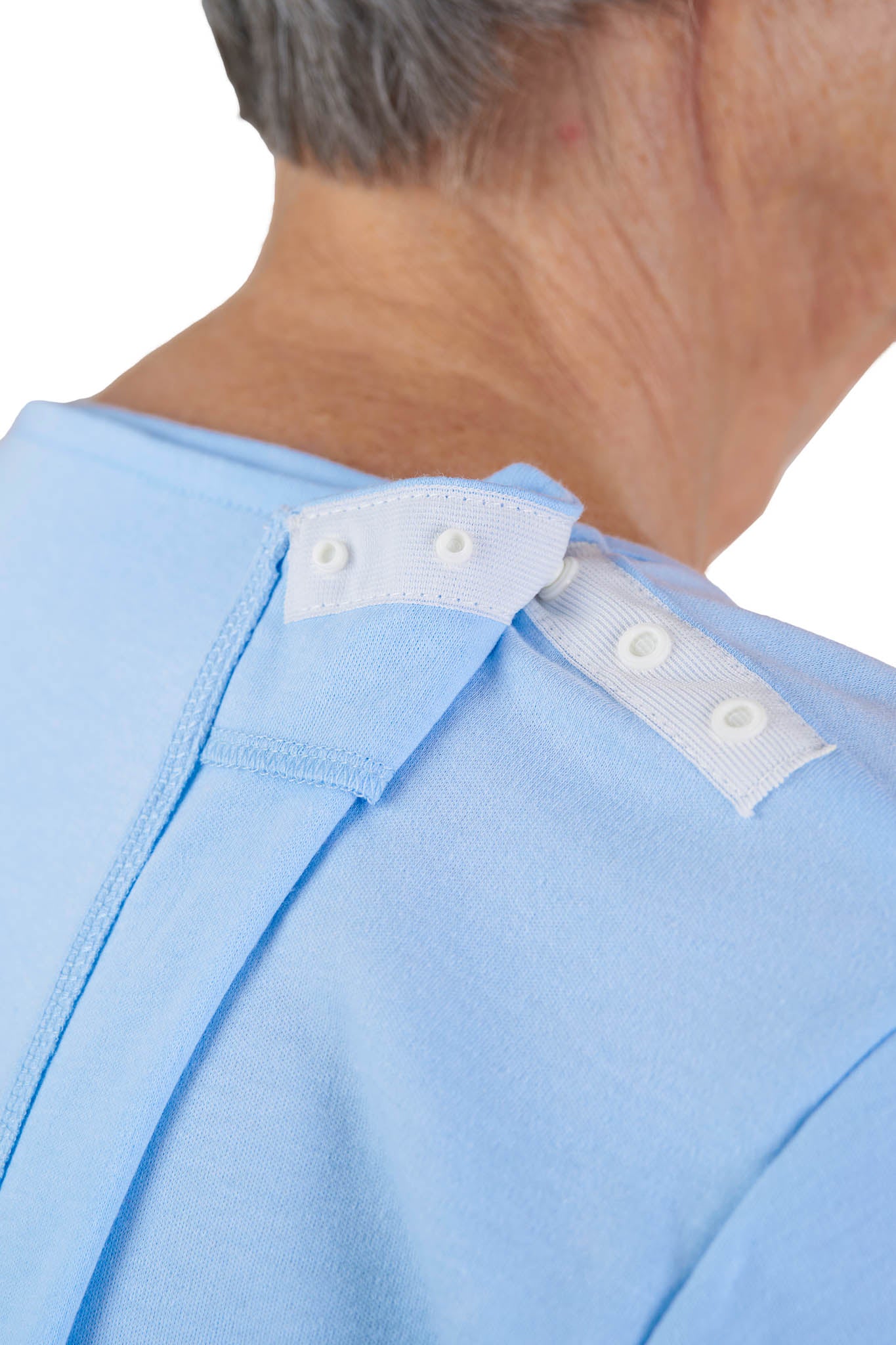 - Snap closures are placed on the shoulders of this pretty patient hospital gown to avoid pressure points when sitting or reclining.