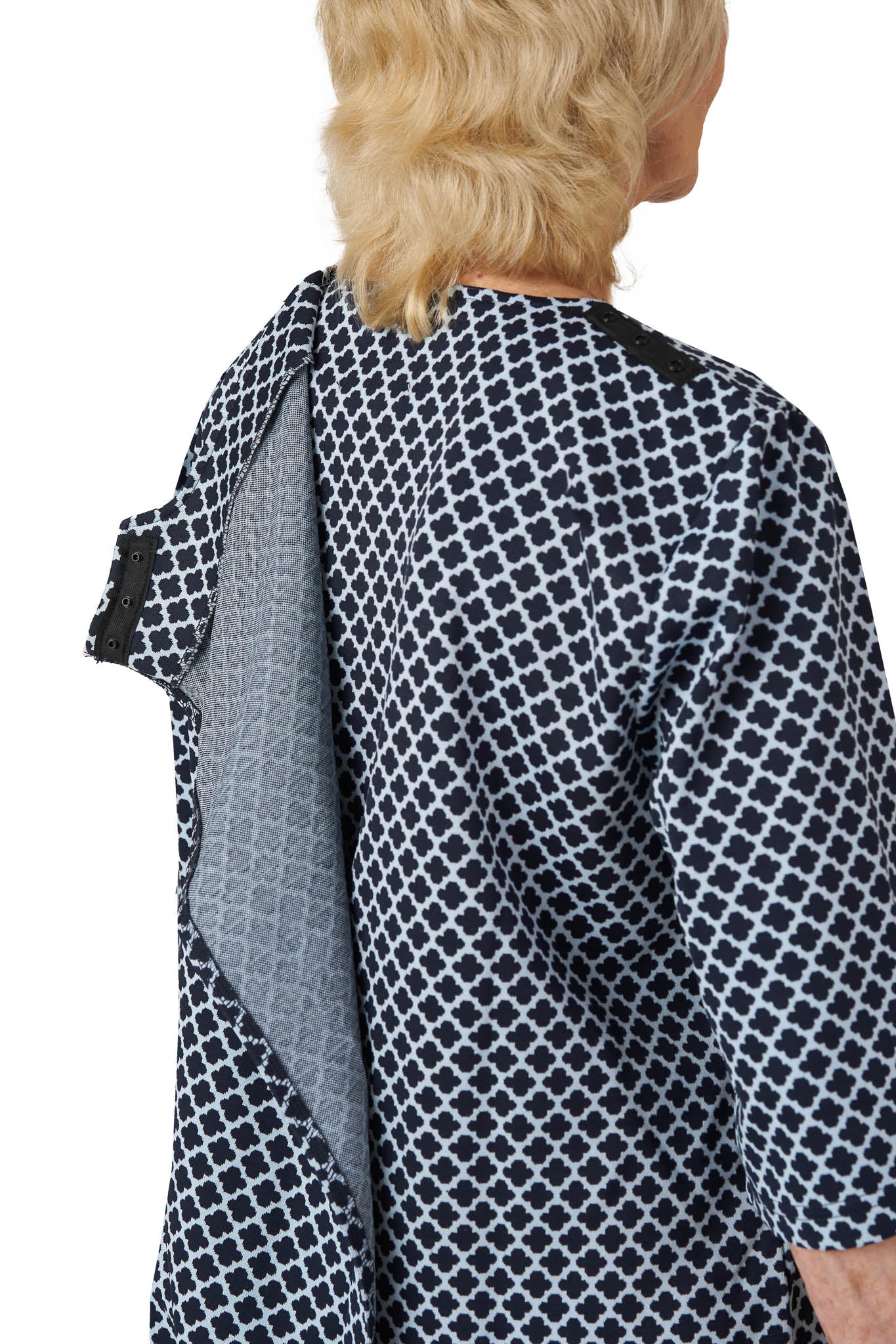 Light weight knit jacquard design, trimmed with light weight rib at collar, front placket and fake pocket welts. Full back opening for easy assisted glide on dressing.